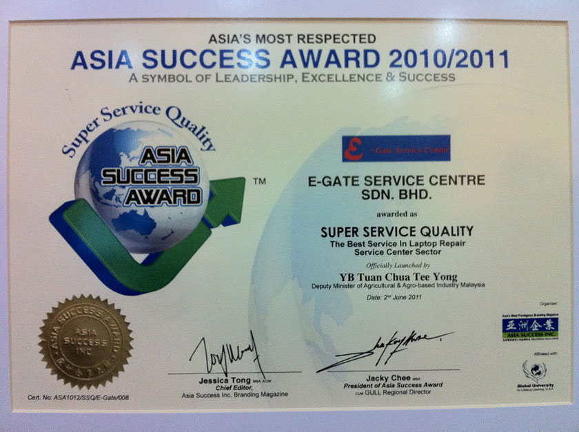 Egate Service Center Sdn Bhd is a local company providing service in computer and notebook repair. Our excellent service was rewarded with accolades such as the "The Best Service in Laptop Repair Service Center Sector" category for Asia Success Award 2010/2011. Apart from providing excellent service to our customers, we also serve as agents to other computer outlets in Malaysia. The price and service we offer are always very competitive in the market.